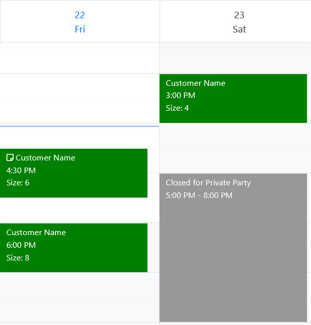Calendar Events allow you to block off timed events in your calendar to remind you and your staff when various events are taking place like a private party, closed for staff meeting, etc.