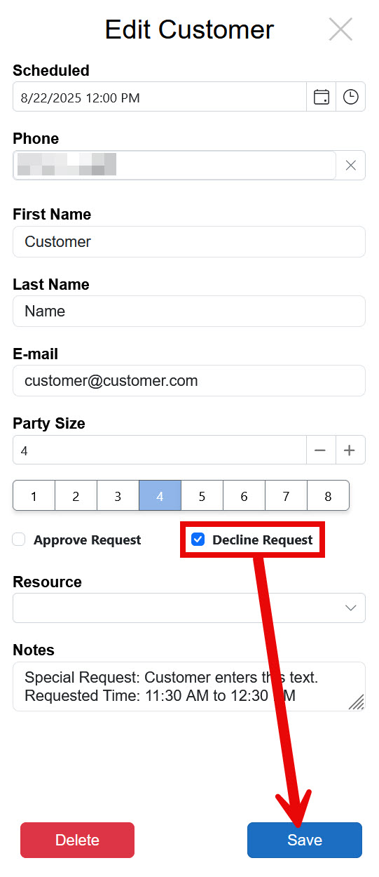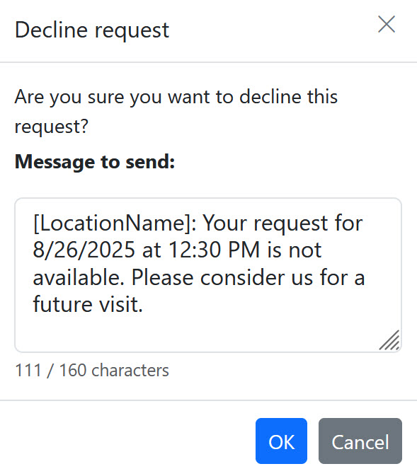 You will be prompted to confirm you want to decline the request, and you can also change the message that will be texted to the customer.